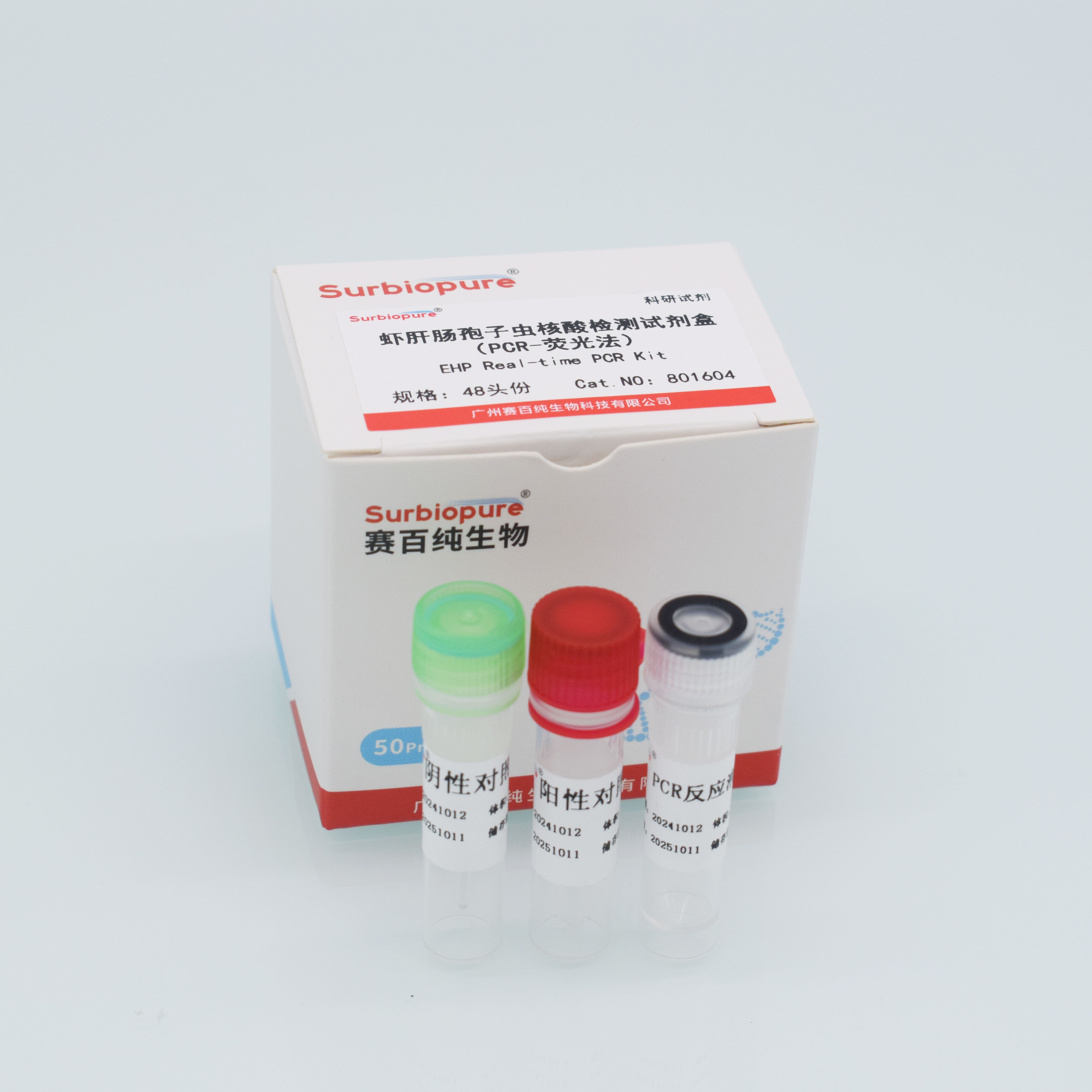 【產品名稱】 通用名稱:蝦肝腸孢子蟲核酸檢測試劑盒(PCR-熒光法) 英文名稱:EHP Real-time PCR Kit 【包裝規格】 48頭份/盒 【預期用途】 本品適用于對蝦、養殖水體中、養殖土壤中、飼料等中蝦肝腸孢子蟲病原體的快速檢測。 【檢驗原理】 本試劑盒利用實時熒光PCR檢測技術,采用蝦肝腸孢子蟲(EHP)的一對特異性引物和一條特異性熒光探針,實現對對蝦、養殖水體中、養殖土壤中、飼料等中蝦肝腸孢子蟲病原體的快速檢測。801604